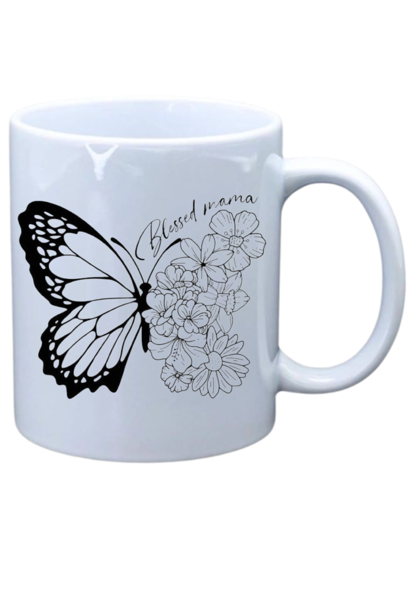 White mug with black and white writing Blessed Mama