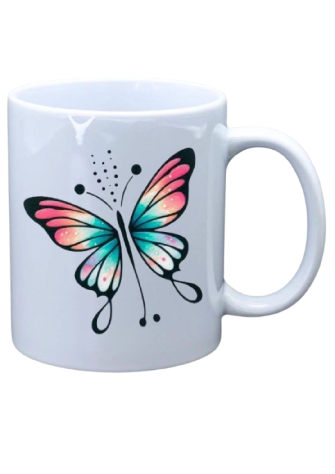 White mug with picture of colorful butterfly