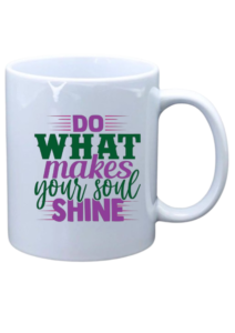 A white mug with colorful purple and green writing Do what makes your soul smile.