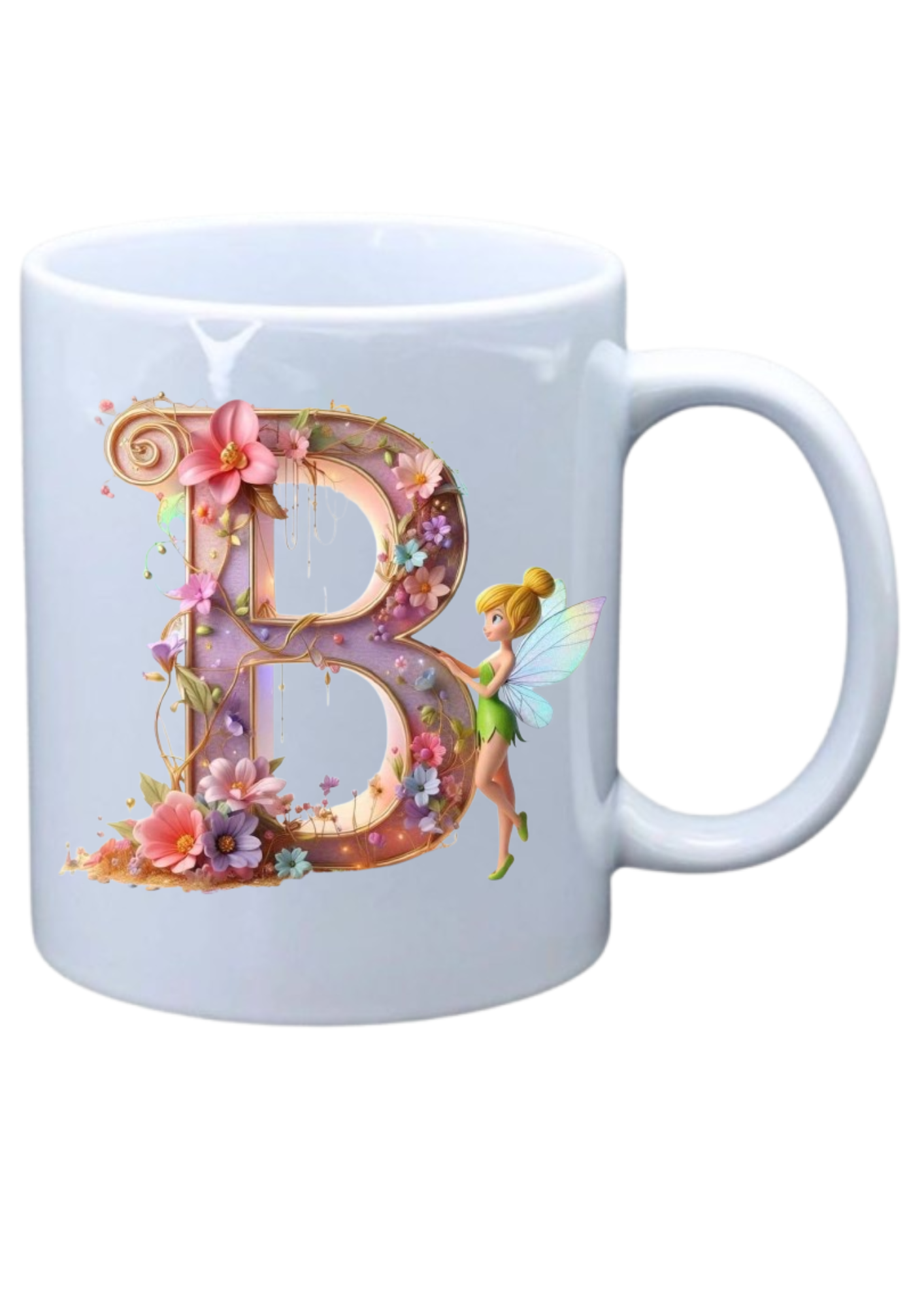 White mug with picture of Alphabet Fairy character in pink