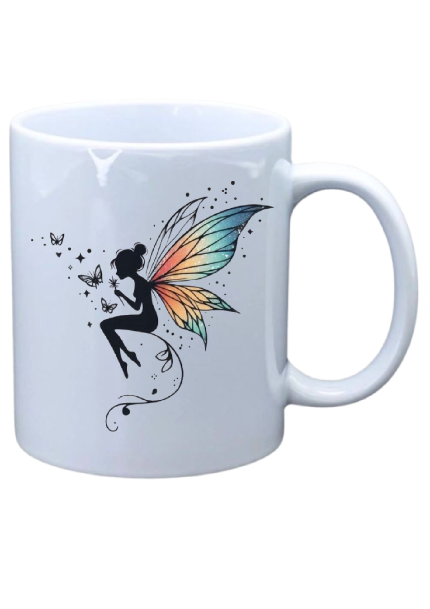 White mug with picture of colorful fairy butterfly