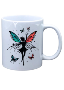 White mug with picture of colorful fairy butterfly