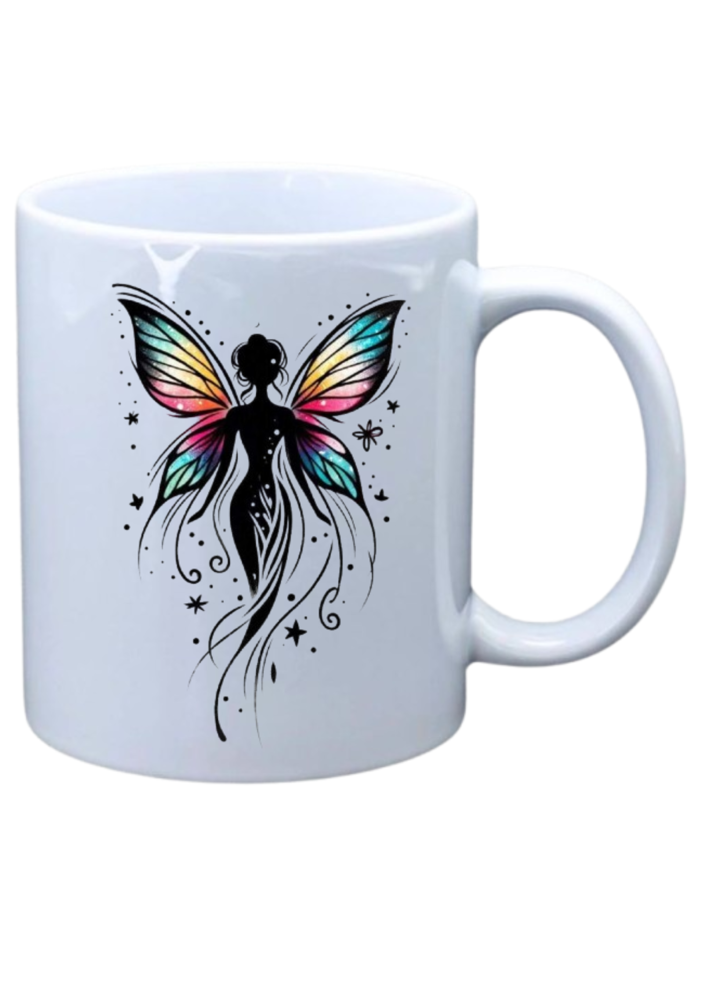White mug with picture of colorful fairy butterfly