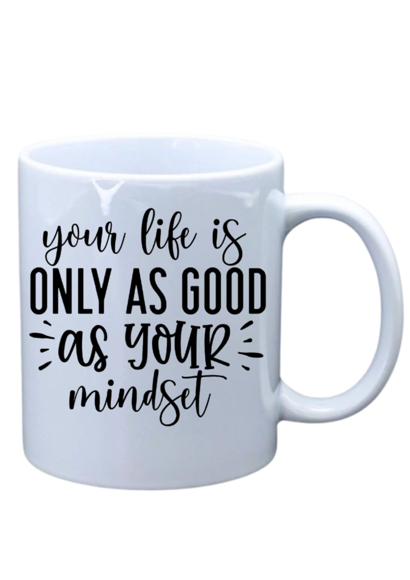 White mug with saying on Your life is only as good as your mindset black and white