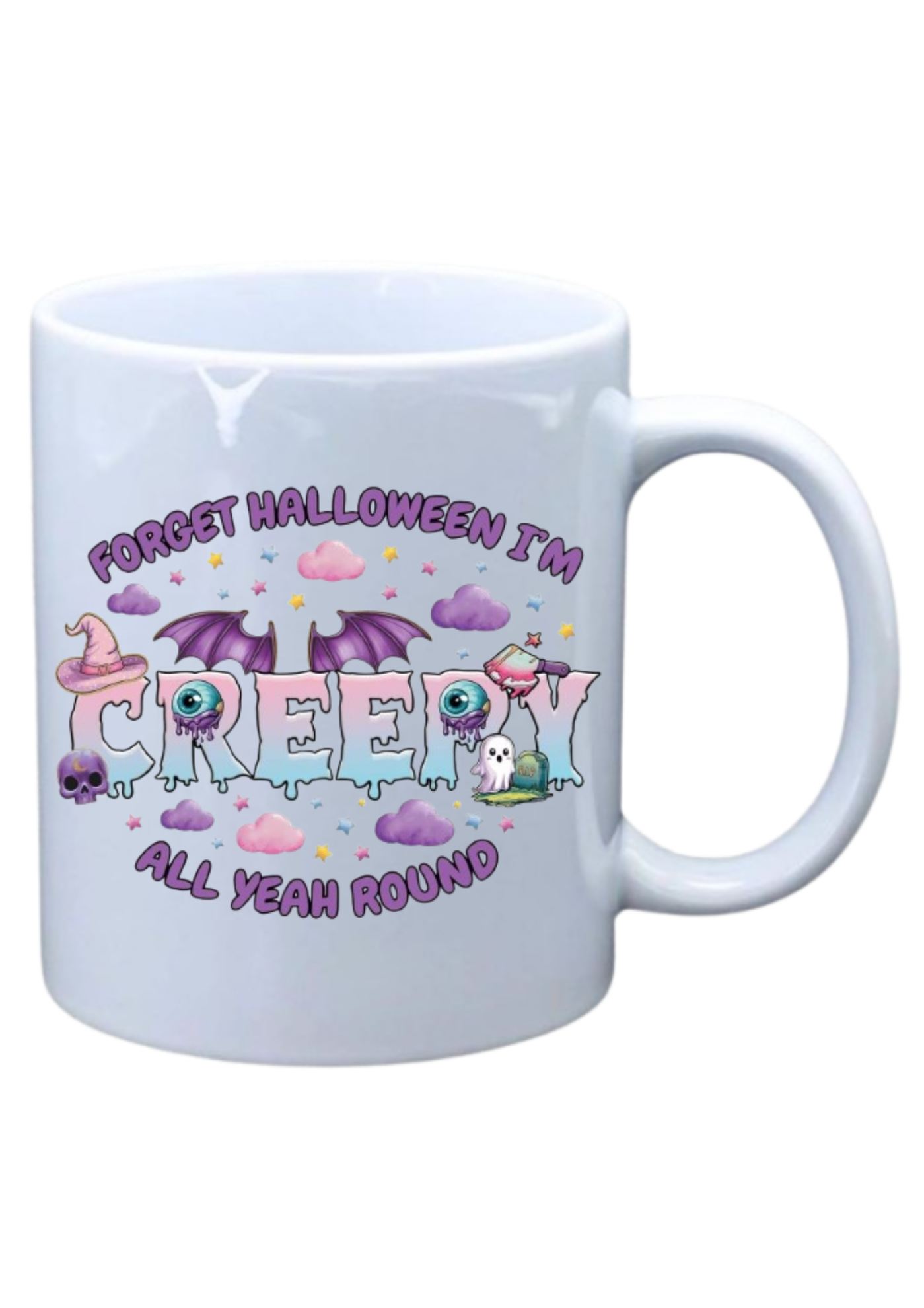 White mug with saying on Forget Halloween I’m creepy all year round with picutre