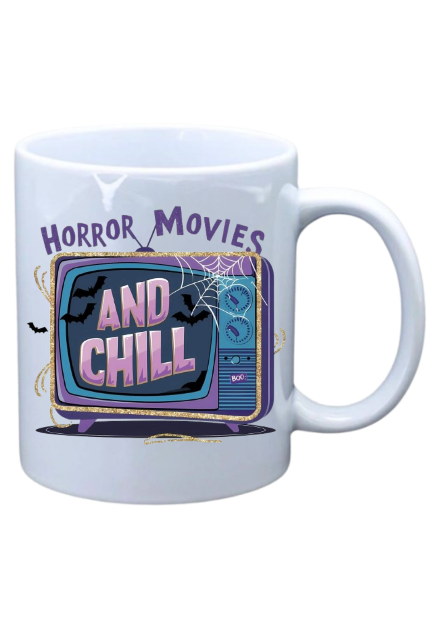 White mug with saying on Horror movies and chill with picture