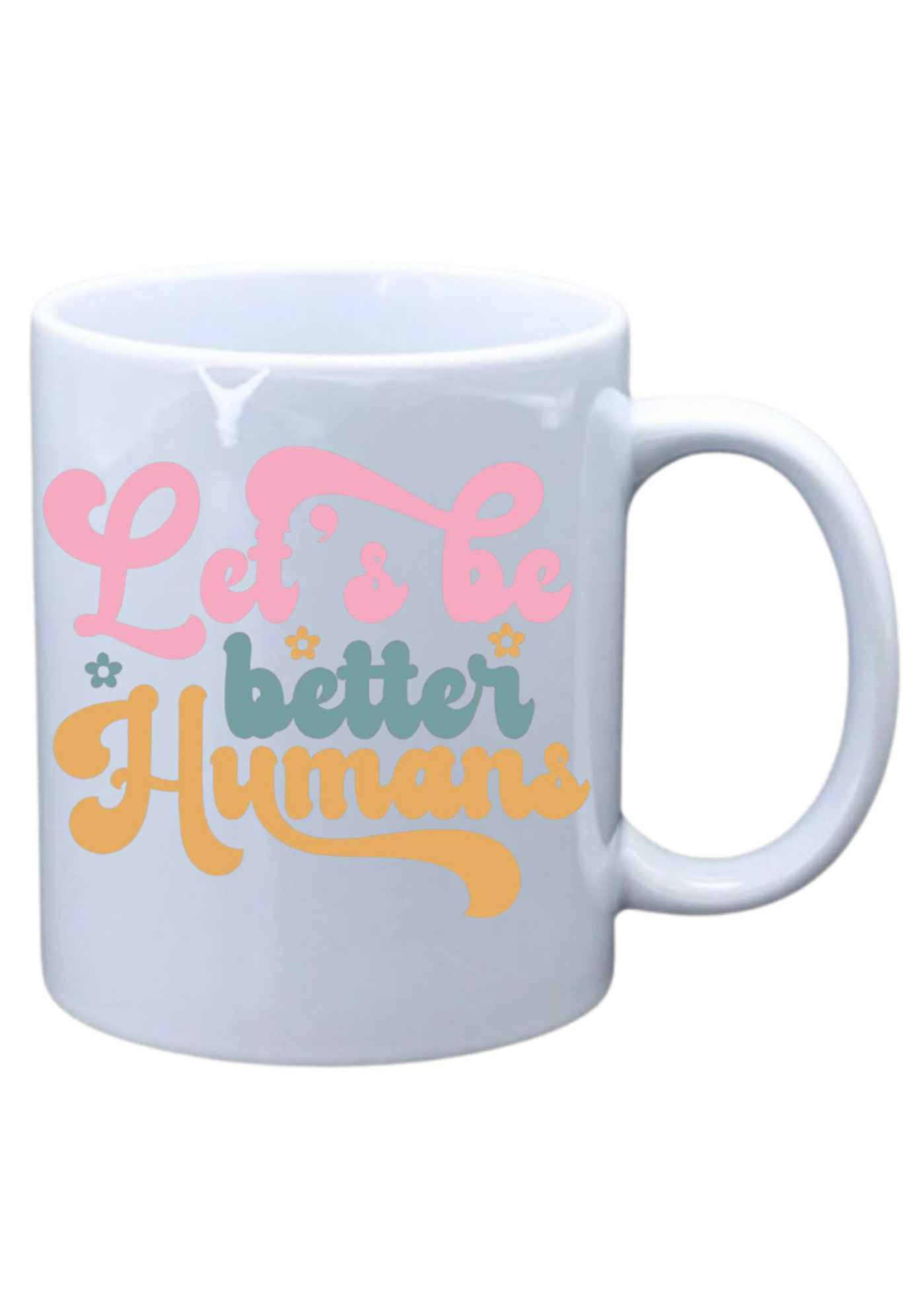 White mug with saying on Lets be better humans in color