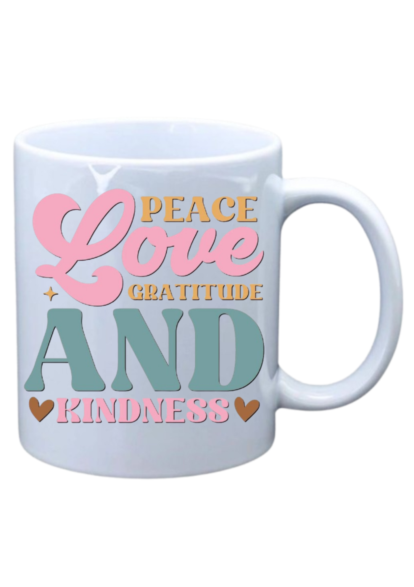 White mug with saying on Peace, Love, Gratitude and kindness in color