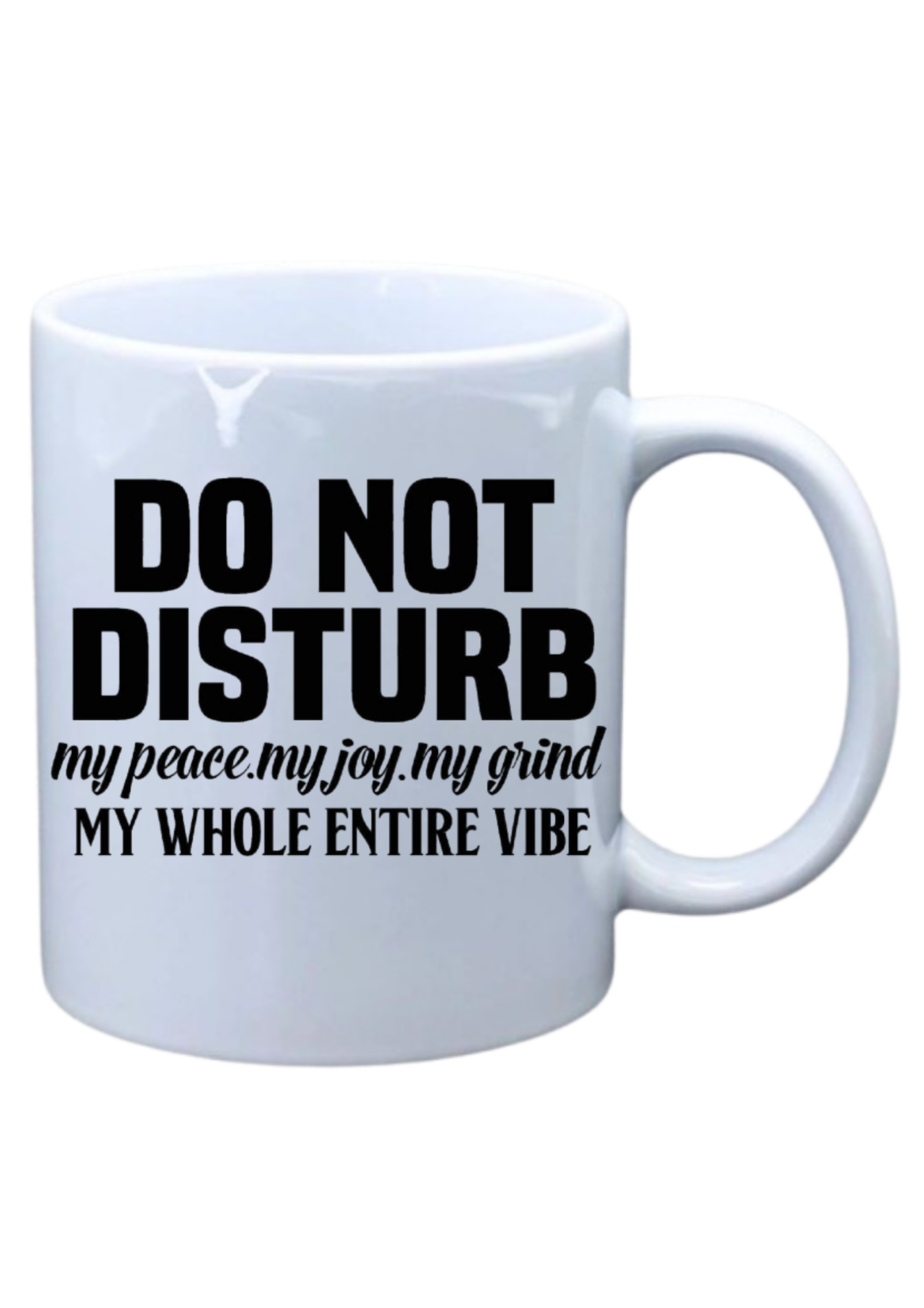 White mug with saying on Do not disturb my peace, my joy, my whole entire vibe in black and white