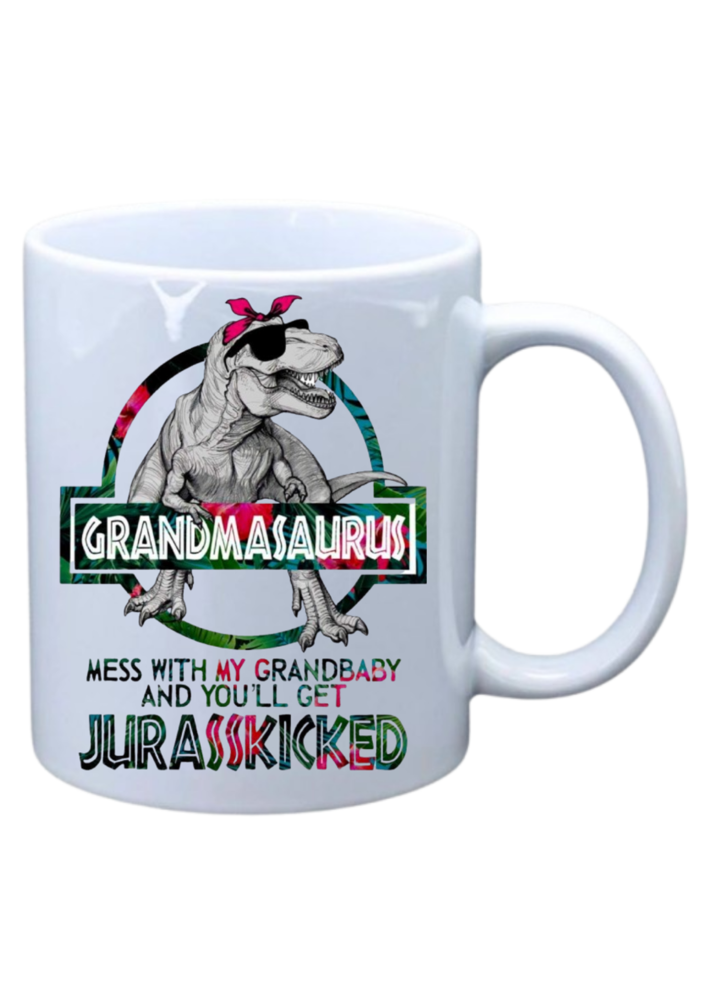 White mug with saying on Grandmasaurus – Mess with my grandbaby and you’ll get Jurasskicked