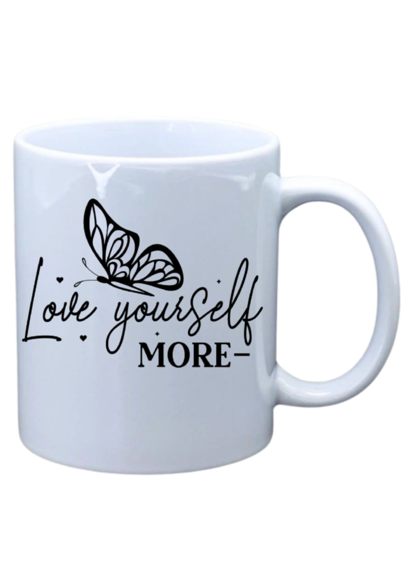 White mug with saying on Love yourself more with butterfly in black and white