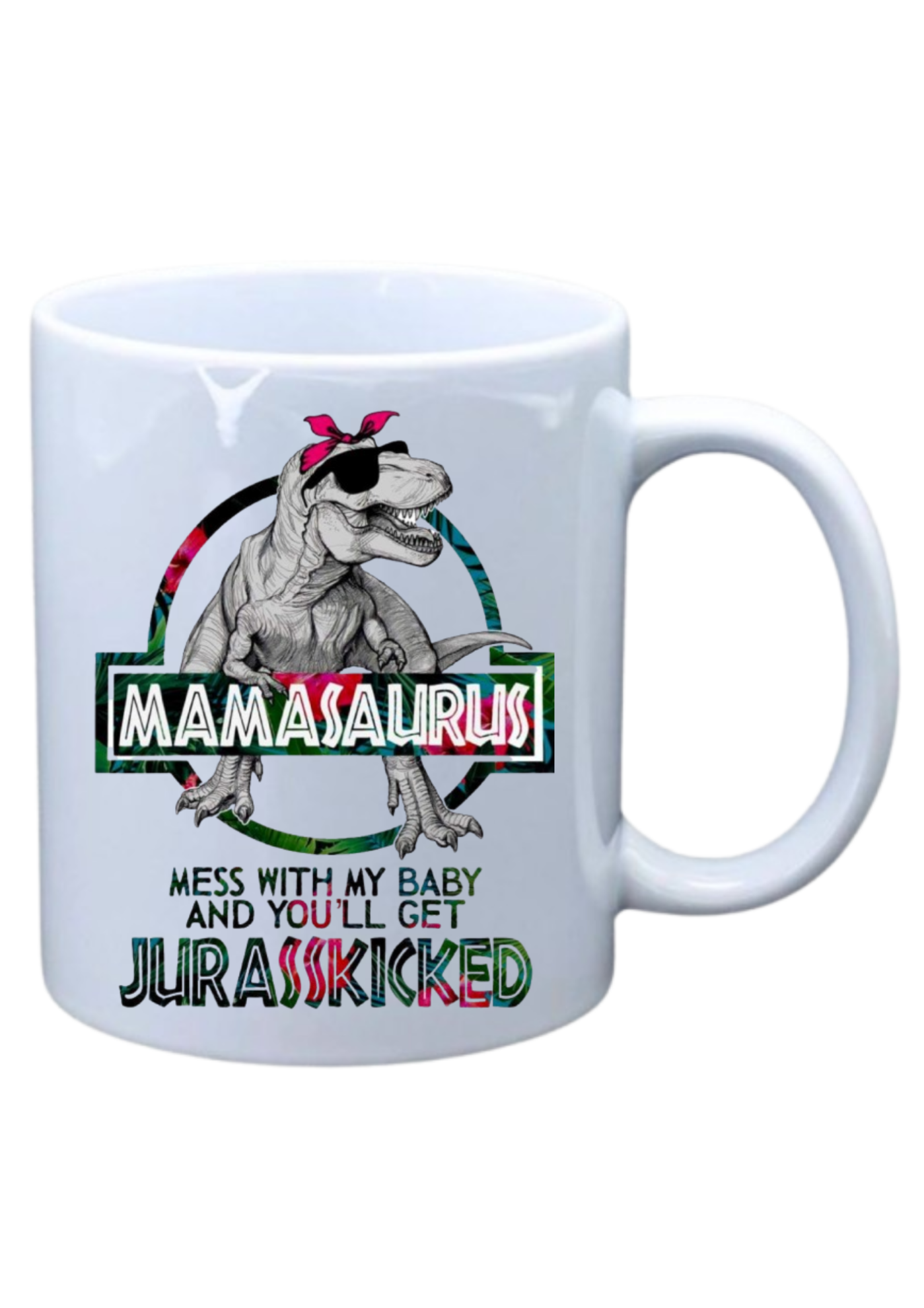 White mug with saying on Mamasaurus – Mess with my baby and you’ll get jurasskicked