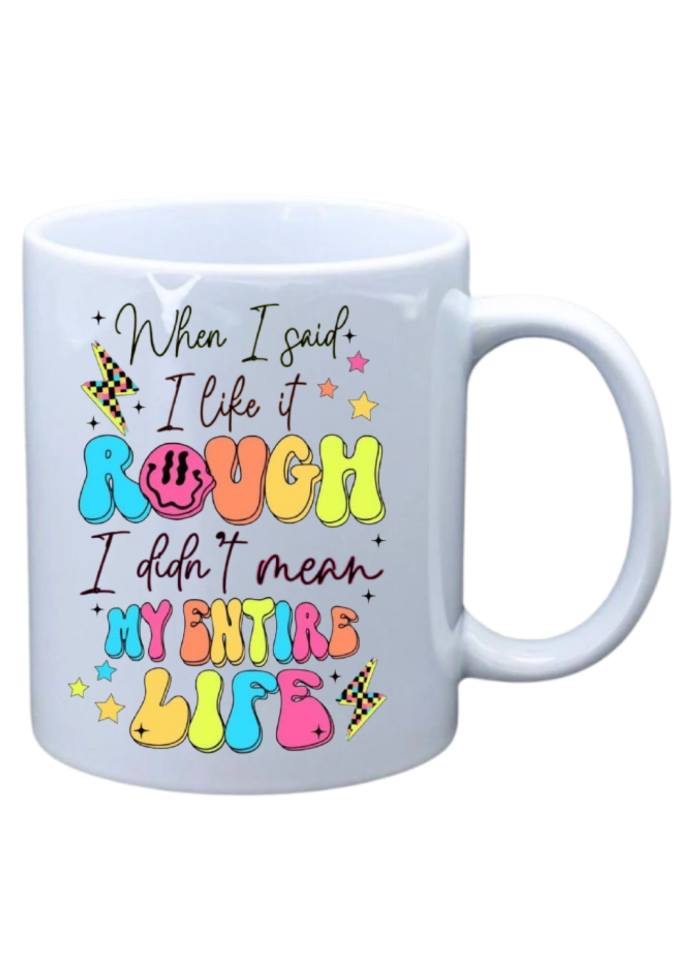 White mug with saying on When I said I like it rough I didn’t mean my entire life