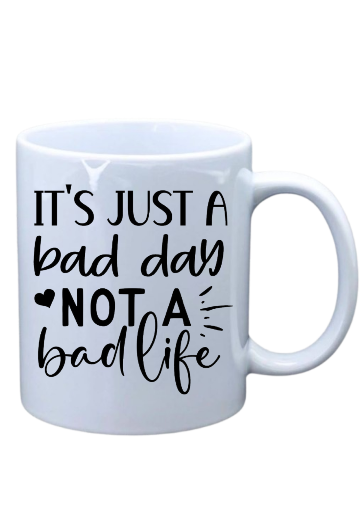 White mug with saying on It’s just a bad day not a bad life black and white writing
